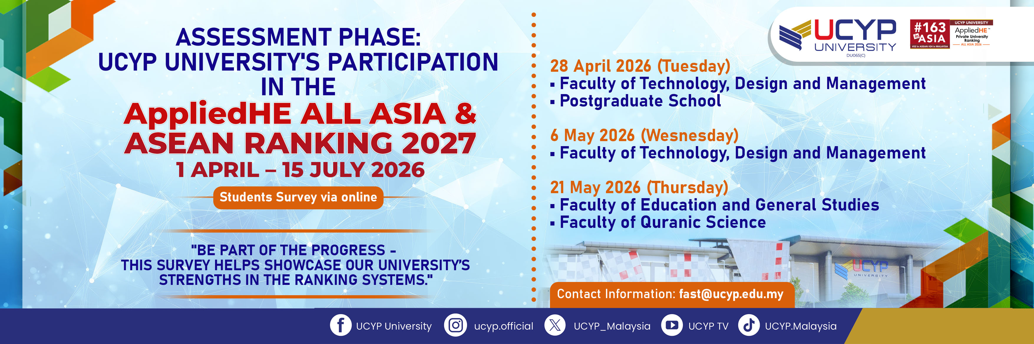 Adaptive is the key concept to the implementation of strategies in UCYP particularly in Academic Excellence, Teaching & Learning, Research & Innovation, Students Experience, Community Engagement, Alumni Network, Branding & Marketing, Industry Engagement, Internationalisation, Human Capital Development, Physical & Intellectual Infrastructure as well as Financial Sustainability.