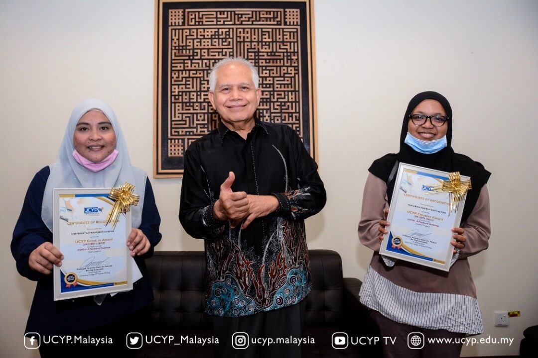 Naib Canselor UCYP, Profesor Emeritus Dato’ Dr. Ahmad Haji Zainuddin bersama Juara UCYP Creative Award Shafawati Atikah binti Shapiee kategori kakitangan (kiri) dan Nur Arina Hazirah Binti Azman bagi kategori pelajar (kanan).
