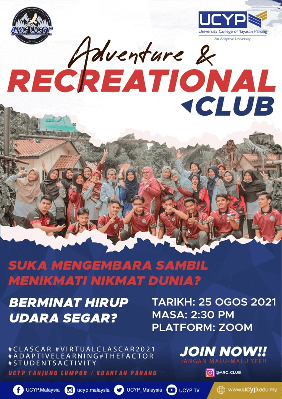 A ‘Virtual Club & Association Carnival 2021’ (Virtual ClasCar 2021) program was held online on 25 August 2021 and attended by Professor Emeritus Dato’ Dr. Ahmad bin Haji Zainuddin, UCYP Vice Chancellor, Associate Professor Dr. Azhar bin Jaafar @ Ramli, Deputy Vice Chancellor (Student Development & Society Engagement) and management team.